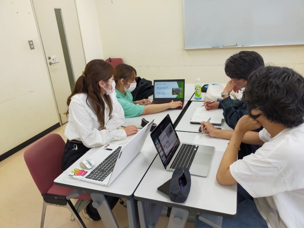 5月18日:第5回目のゼミでは前半、実地調査の結果をグループ内で発表し、良かった点を共有しました。後半、キャナルシティ博多を調査するための項目をグループ内で考案し発表しました。
