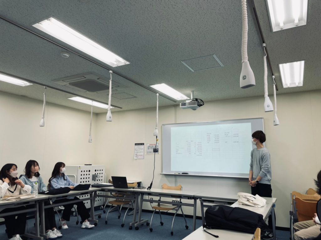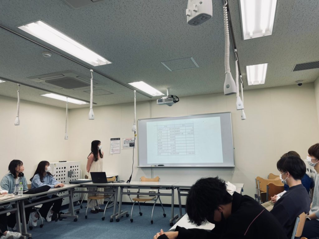 5月10日:今回のゼミでは前回各班で話し合った収支計画の発表を行いました。また違う班のメンバーからの質問に答えていきました。