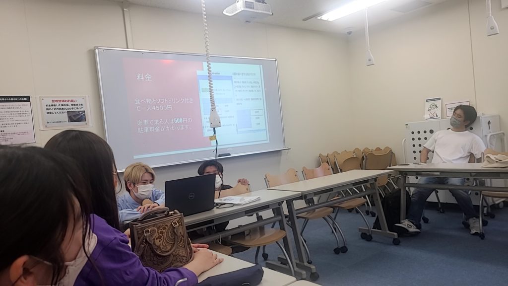 5月24日:今日の講義では前半に7月に行われるBBQ内容の確認、先週グループで話し合って作成した各自イベントのポジショニングマップについての質疑応答を行いました。後半では各自のイベントについて実施計画書作成の練習を行いました。