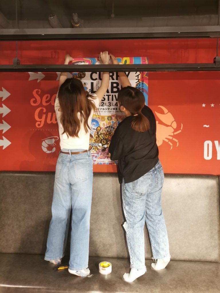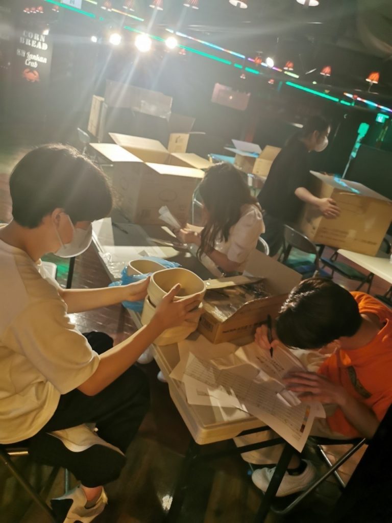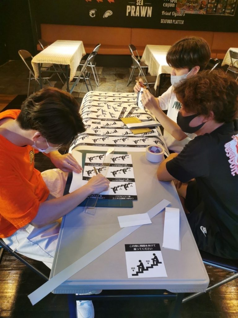 1日 初日は、準備を中心に行いました。男子は机や椅子の運び入れ、女子は以前使っていたお店のロゴをポスターで隠す作業を行いました。一通り終わったあとに、紙の切り抜き・参加するお店に配る器やスプーン等の仕分けを行いました。